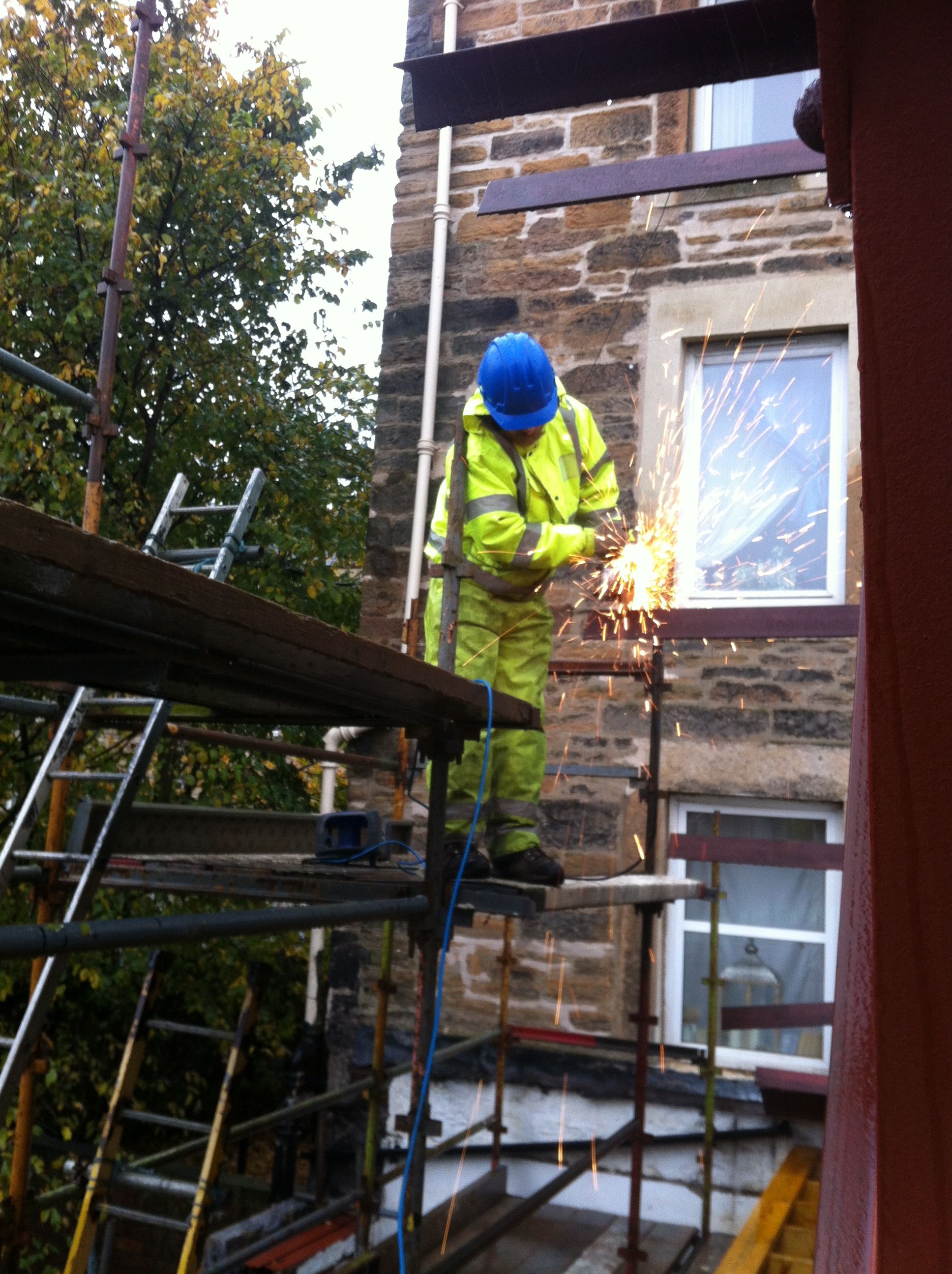 birthday_sparkler!_(aka grinding ends off purlins) Published October 21, 2012 at 1936 × 2592 in scaff goes up, frost sets in. And Happy Birthday Even!